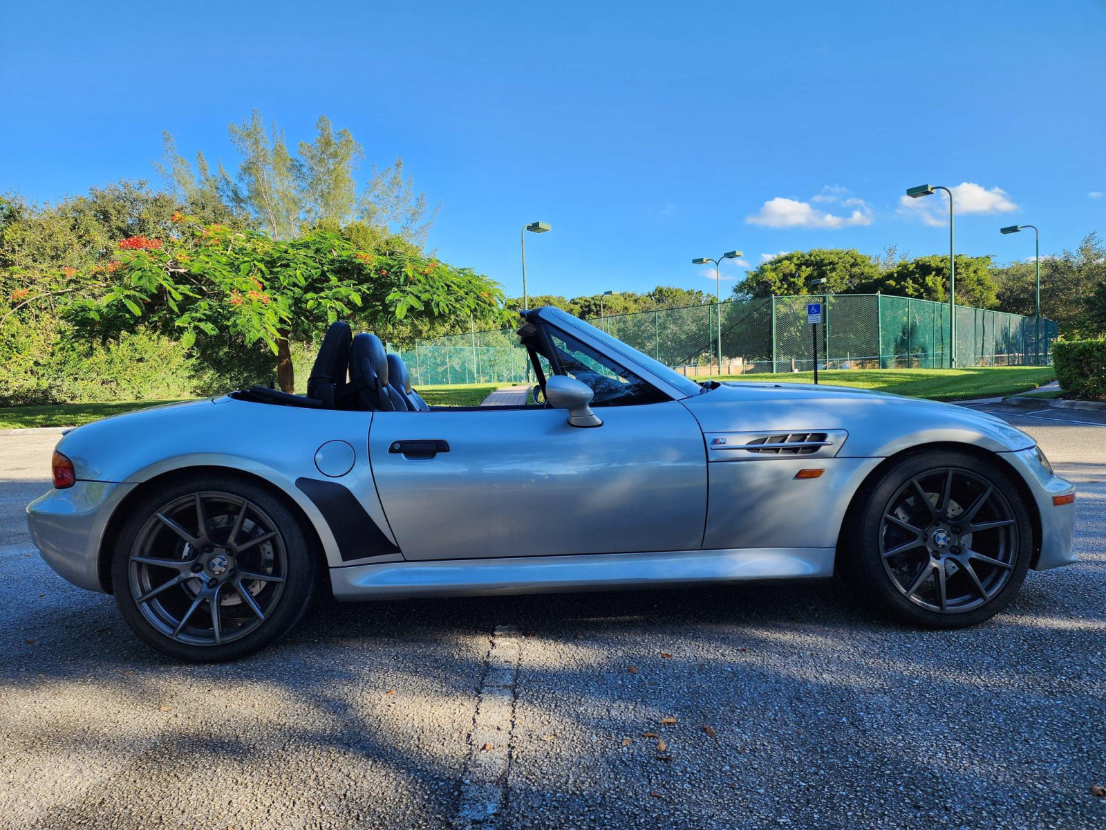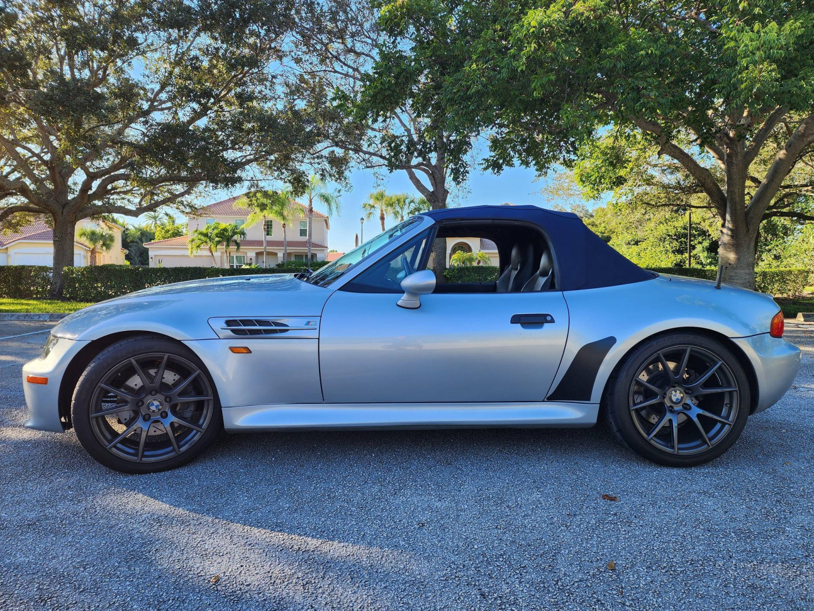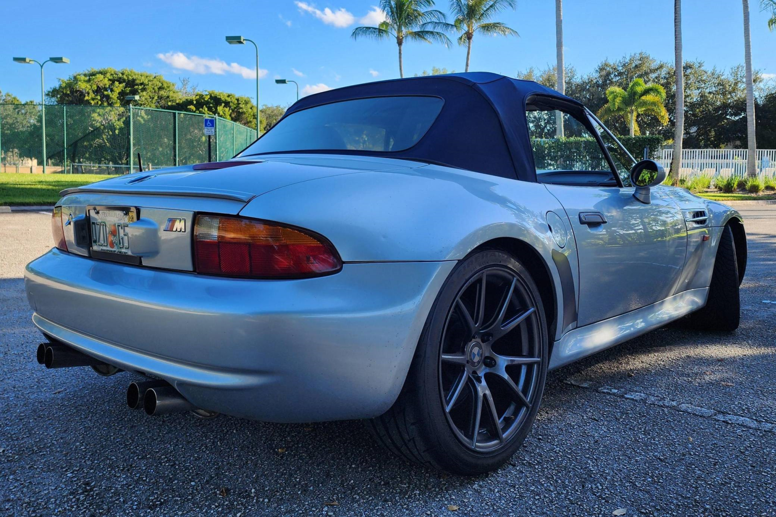 THIS… is a 1998 BMW Z3 M Roadster, finished in Arctic Silver Metallic with a body-colored hardtop, a blue soft top, and a black interior.