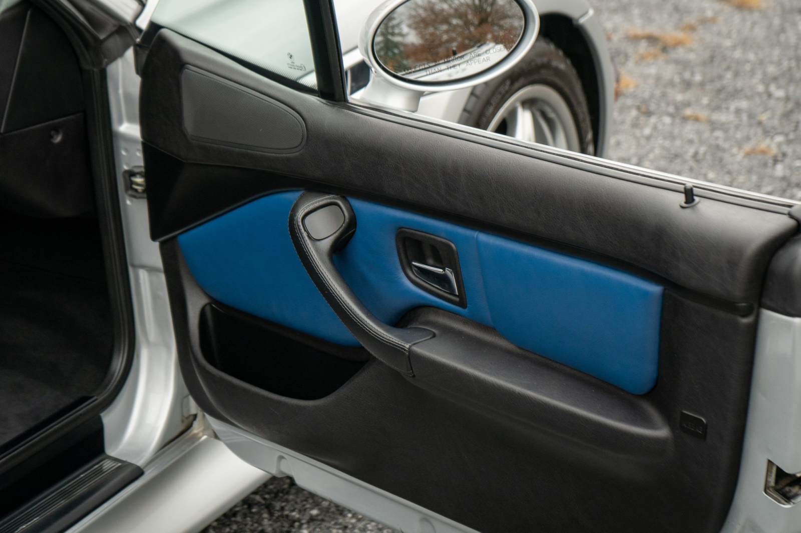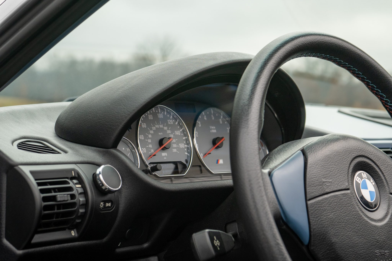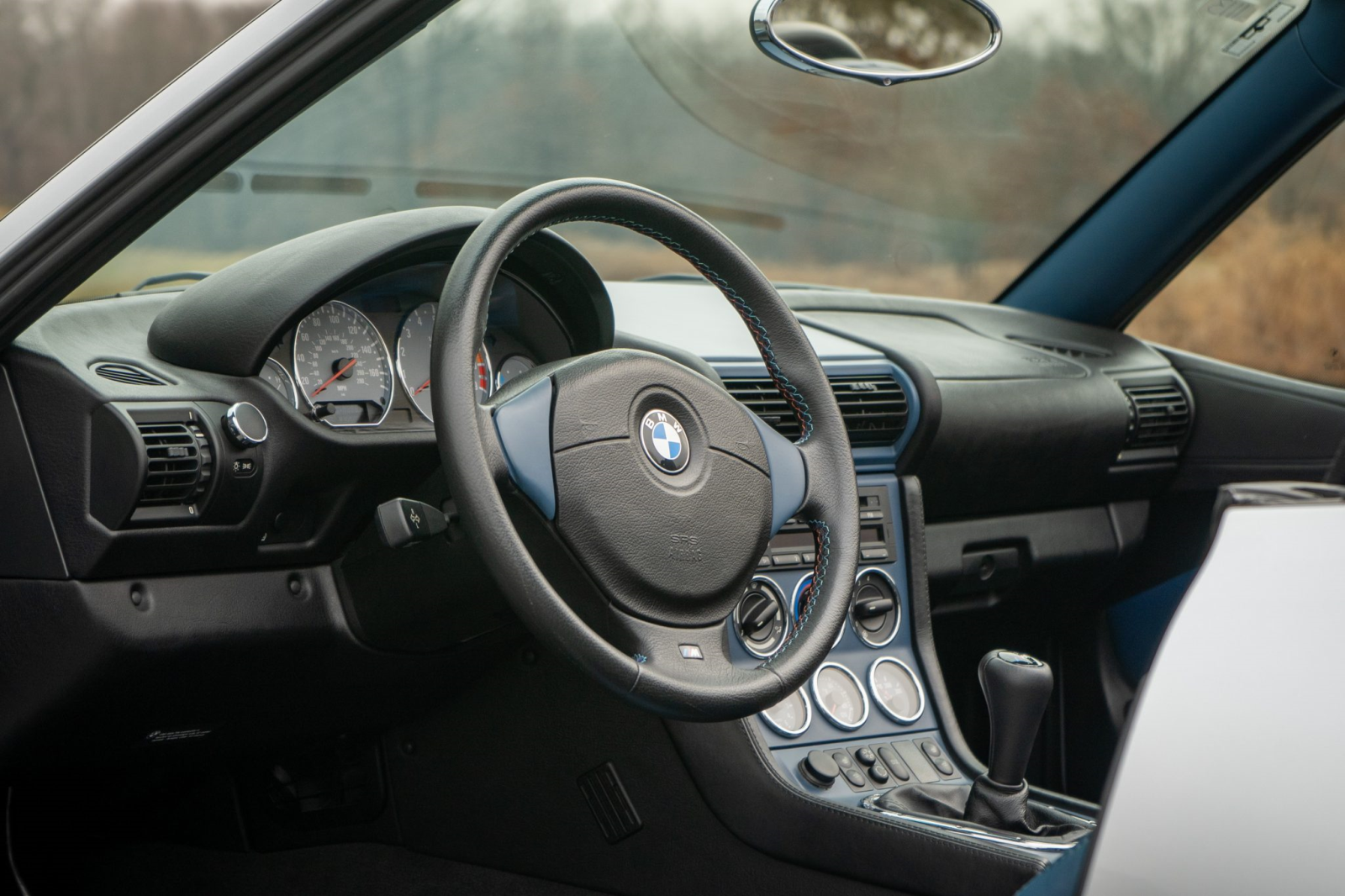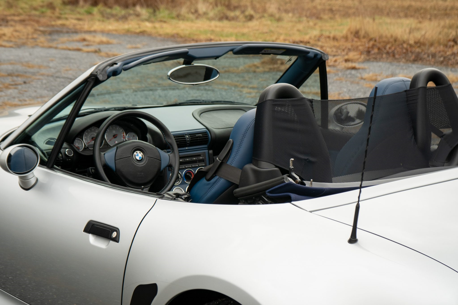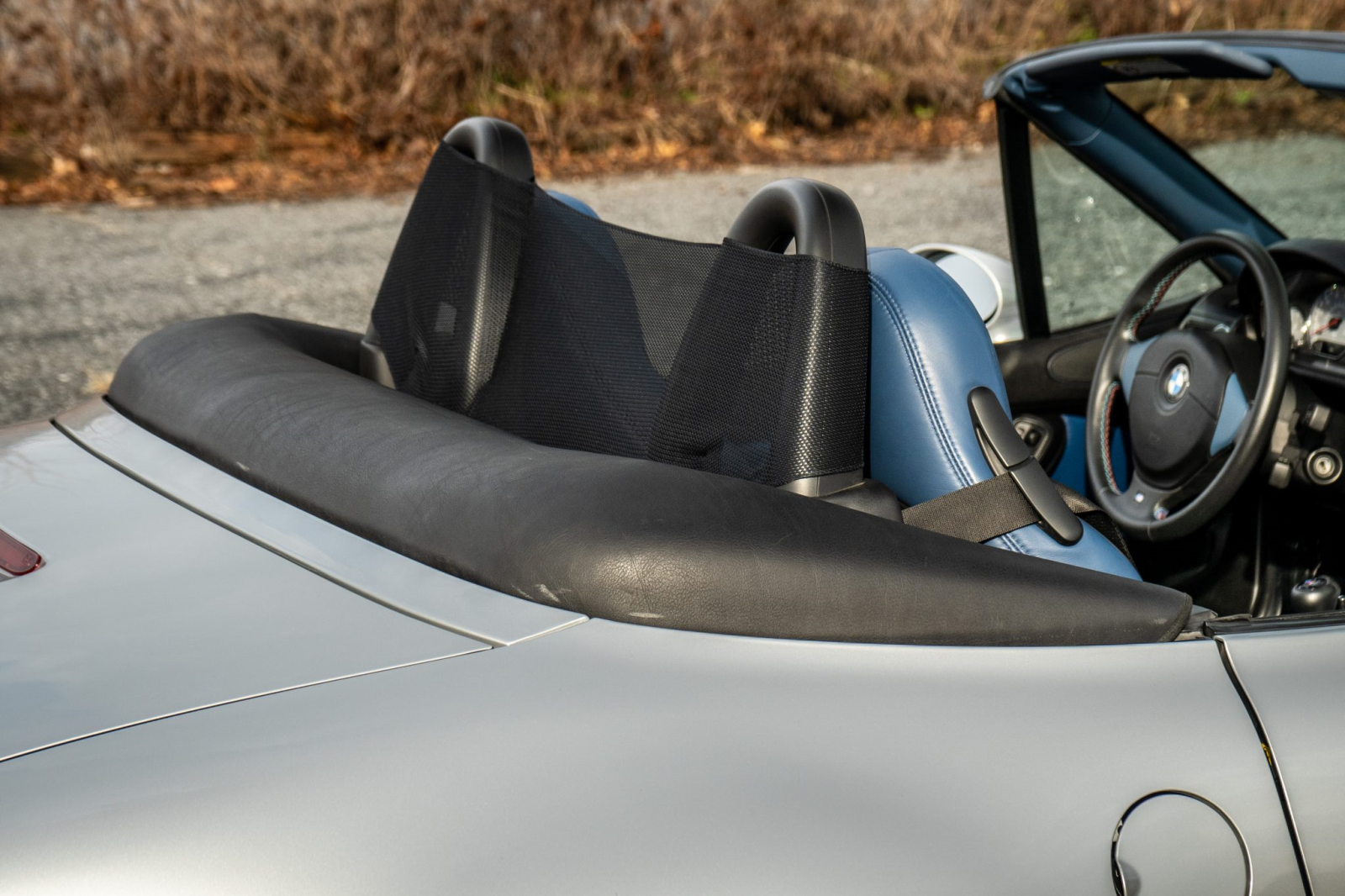 This M Roadster is one of six finished in Titanium Silver Metallic (354) over Estoril Blue and black Nappa leather for the North American market for the model year. Features include a power-operated dark blue convertible soft top as well as front fender vents and quad exhaust outlets. Window replacement is noted on the Carfax report in July 2016. Clear paint protection film covers the nose and photos of paint meter readings are provided in the gallery below.
