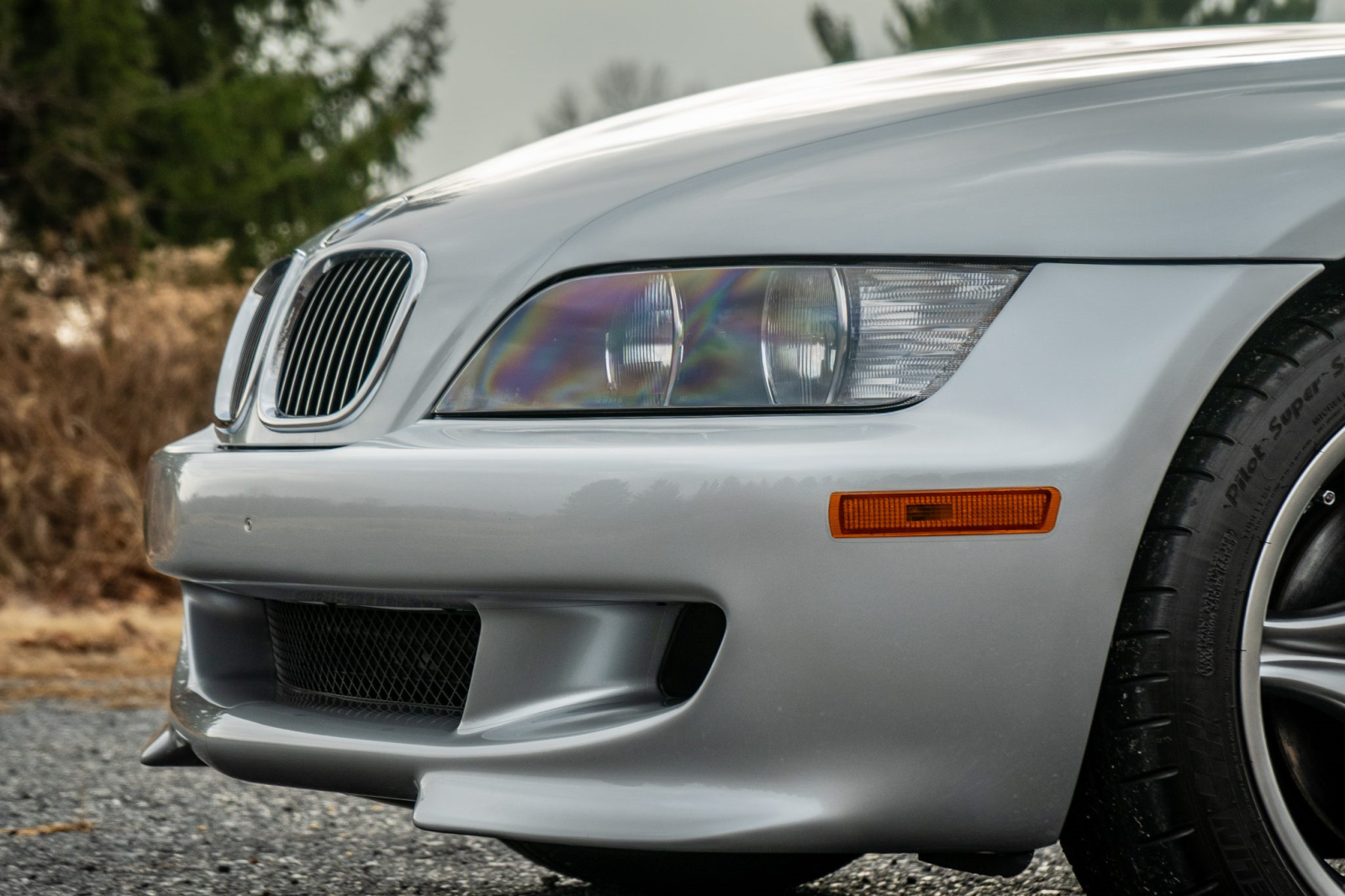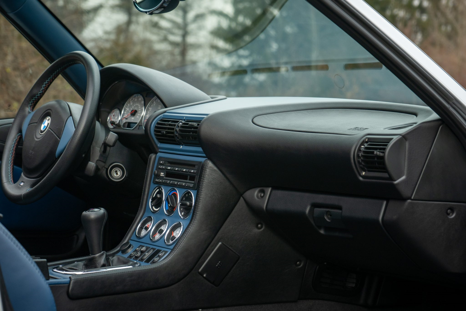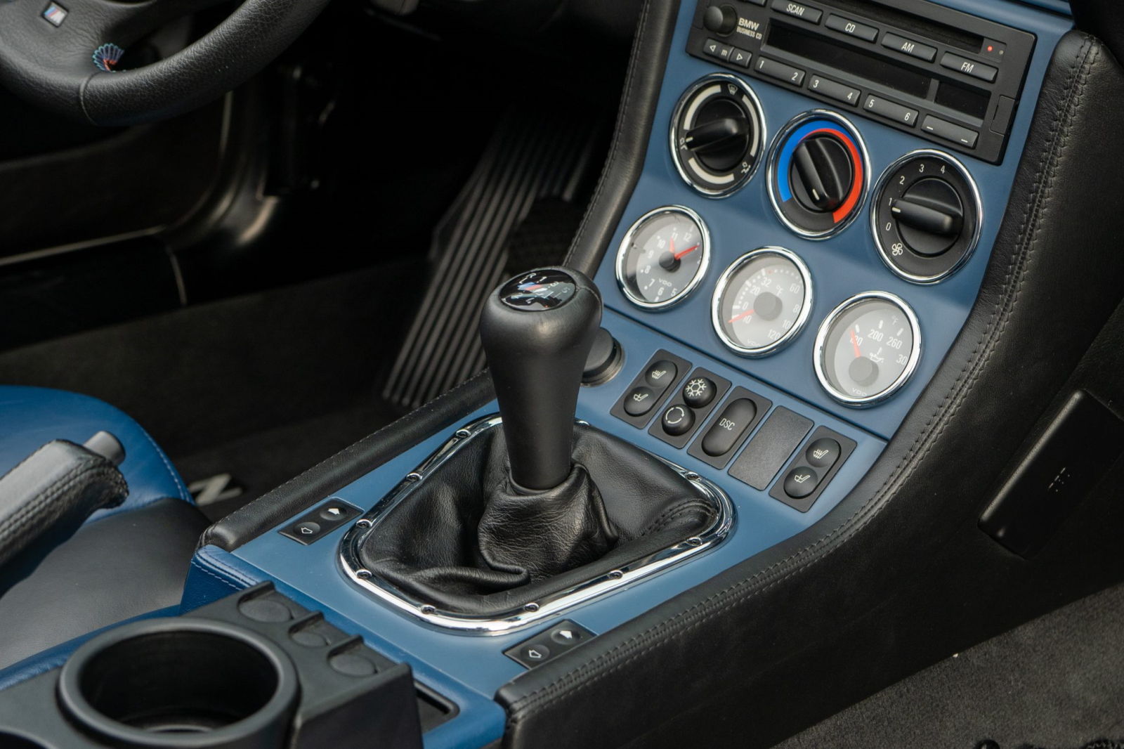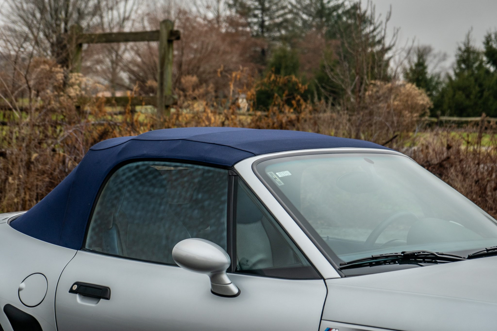 This M Roadster is one of six finished in Titanium Silver Metallic (354) over Estoril Blue and black Nappa leather for the North American market for the model year. Features include a power-operated dark blue convertible soft top as well as front fender vents and quad exhaust outlets. Window replacement is noted on the Carfax report in July 2016. Clear paint protection film covers the nose and photos of paint meter readings are provided in the gallery below.