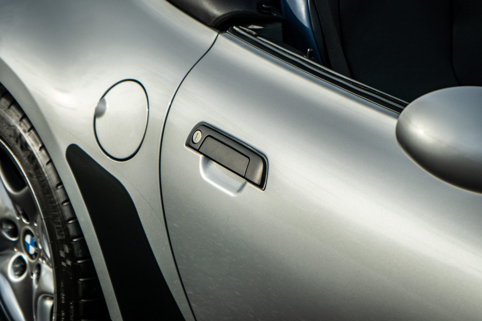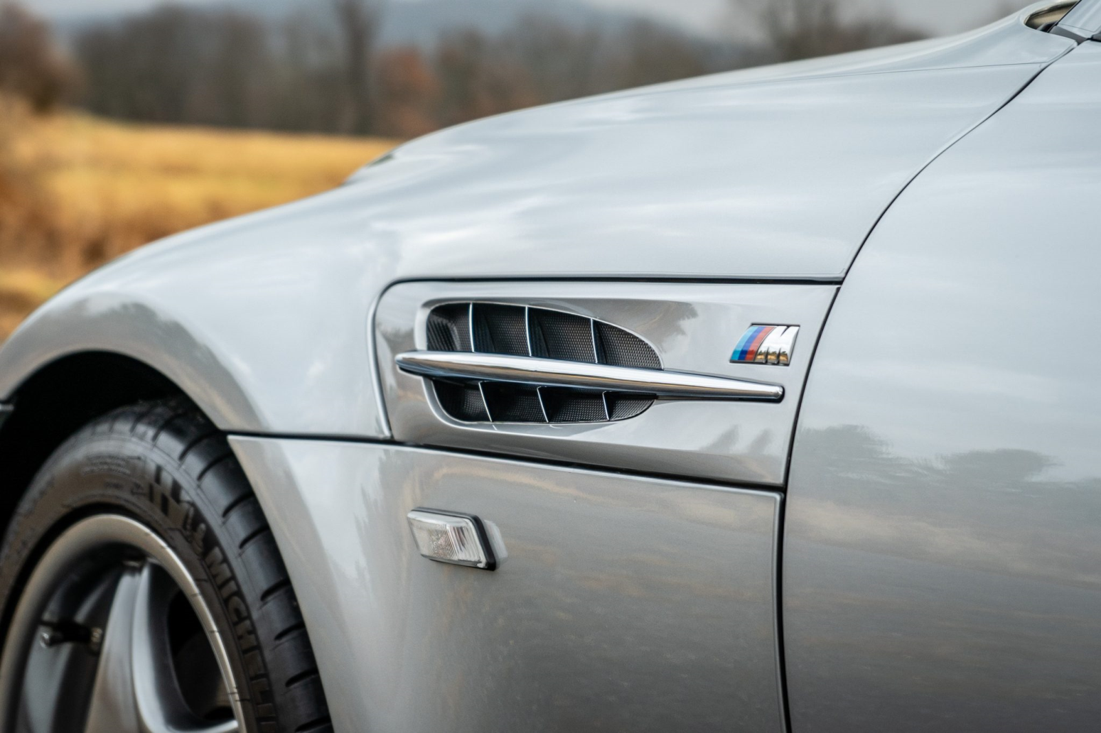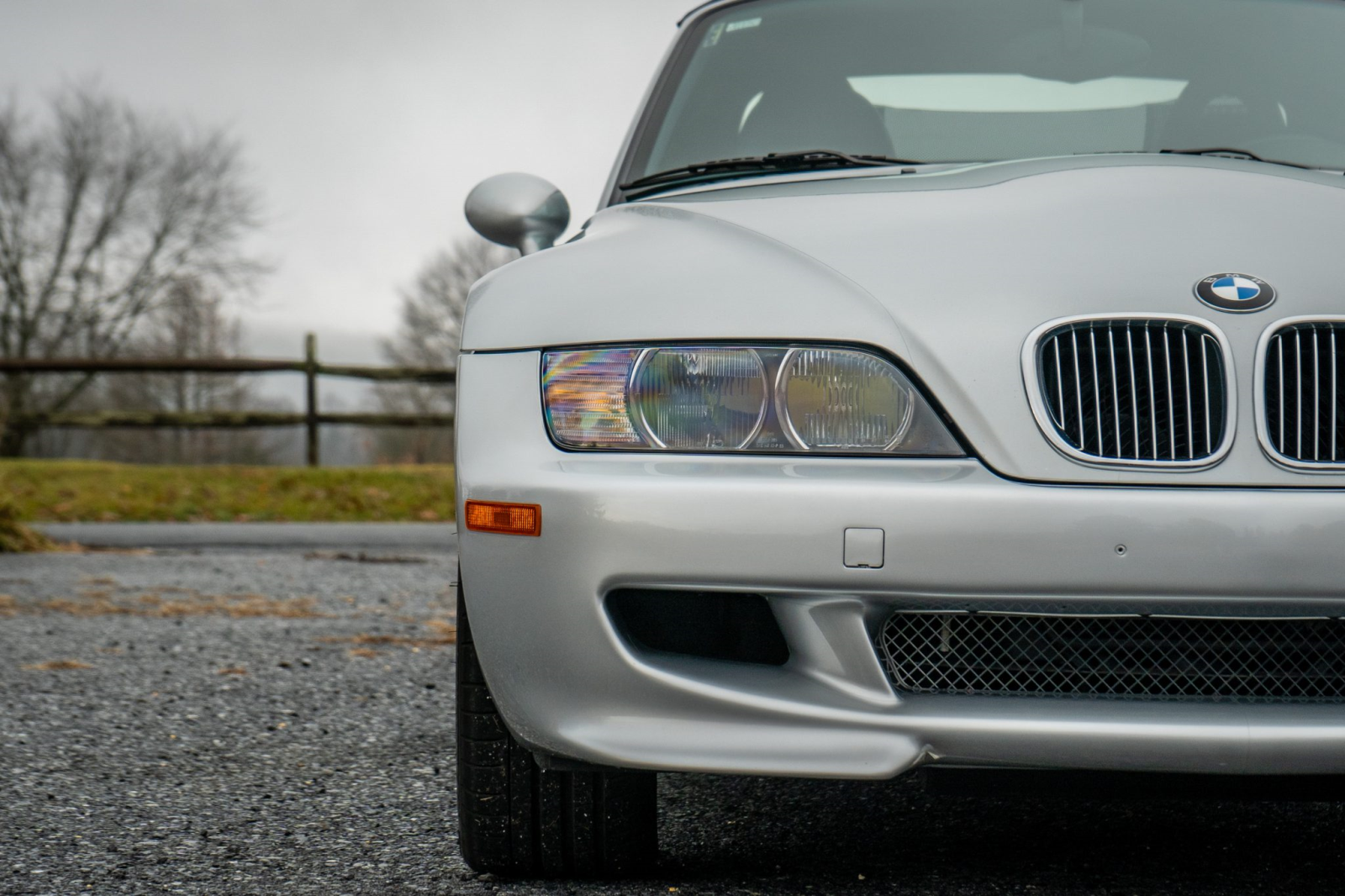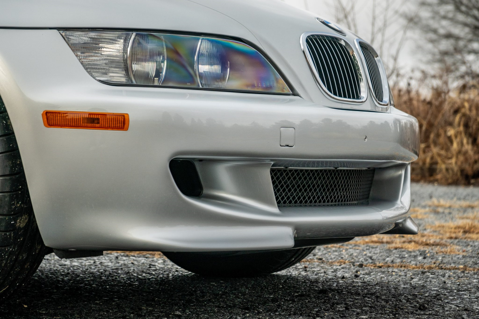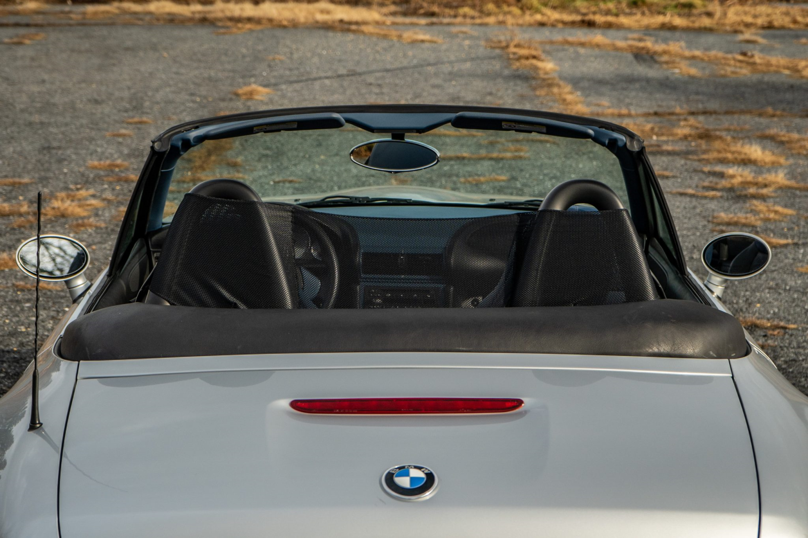 This M Roadster is one of six finished in Titanium Silver Metallic (354) over Estoril Blue and black Nappa leather for the North American market for the model year. Features include a power-operated dark blue convertible soft top as well as front fender vents and quad exhaust outlets. Window replacement is noted on the Carfax report in July 2016. Clear paint protection film covers the nose and photos of paint meter readings are provided in the gallery below.
