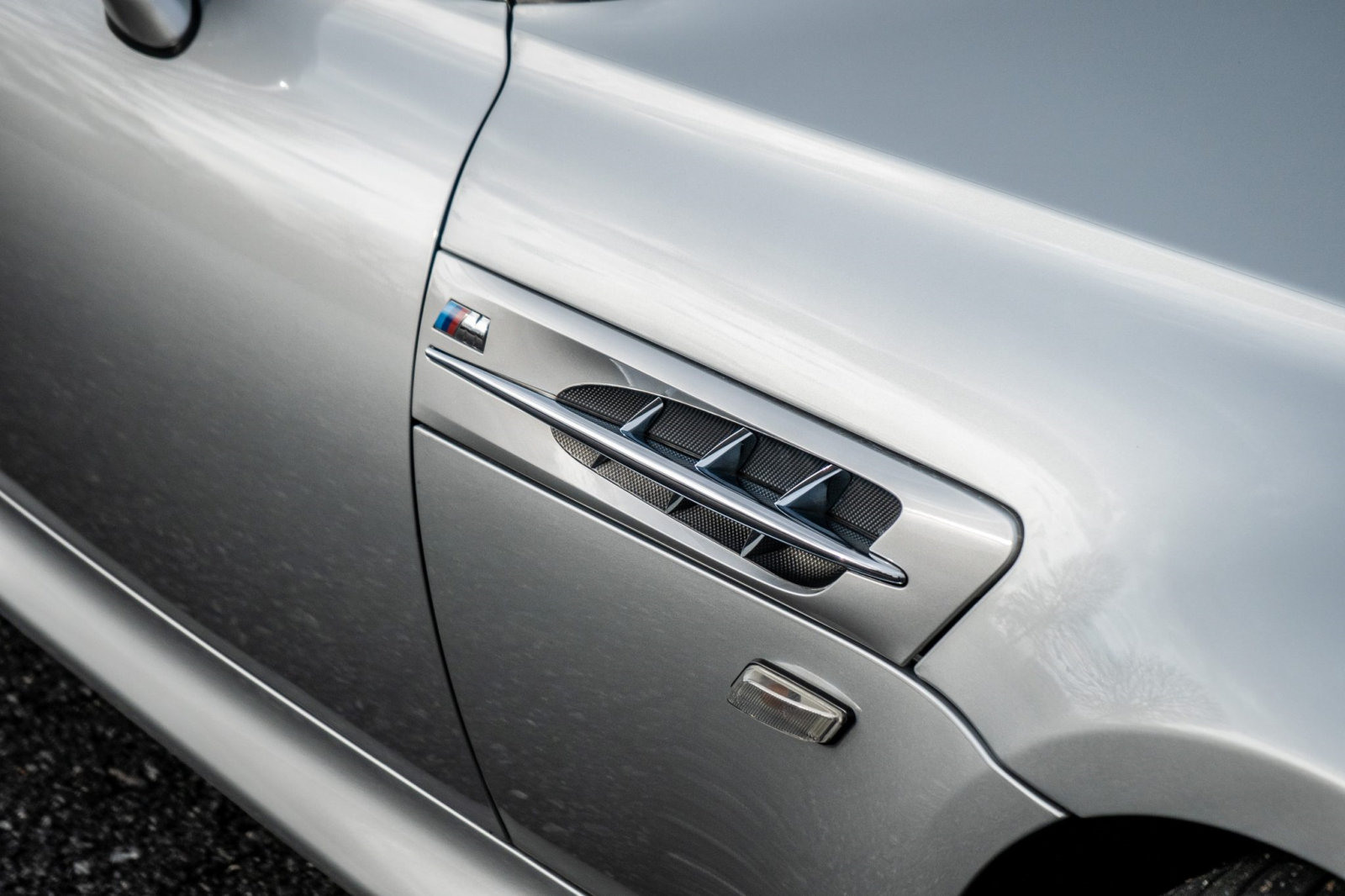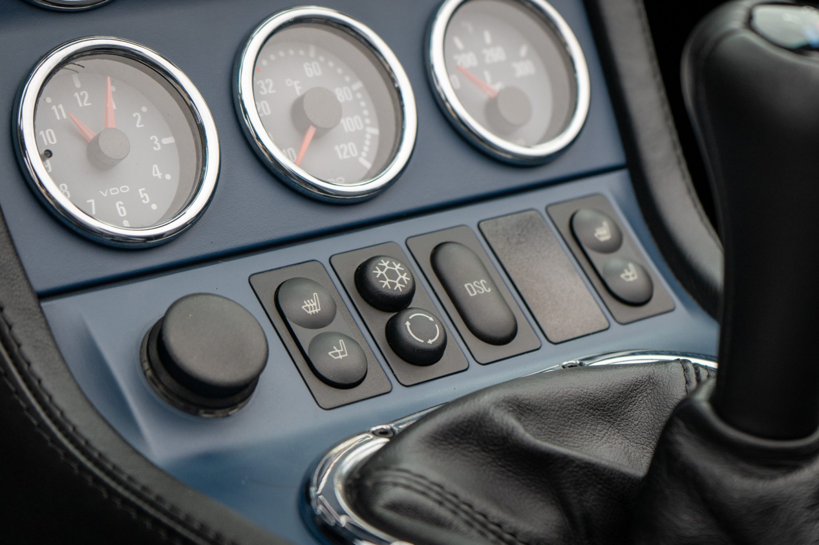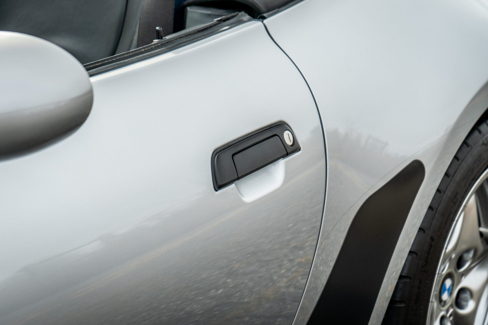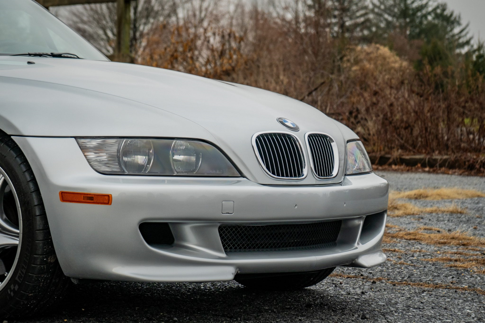 This M Roadster is one of six finished in Titanium Silver Metallic (354) over Estoril Blue and black Nappa leather for the North American market for the model year. Features include a power-operated dark blue convertible soft top as well as front fender vents and quad exhaust outlets. Window replacement is noted on the Carfax report in July 2016. Clear paint protection film covers the nose and photos of paint meter readings are provided in the gallery below.