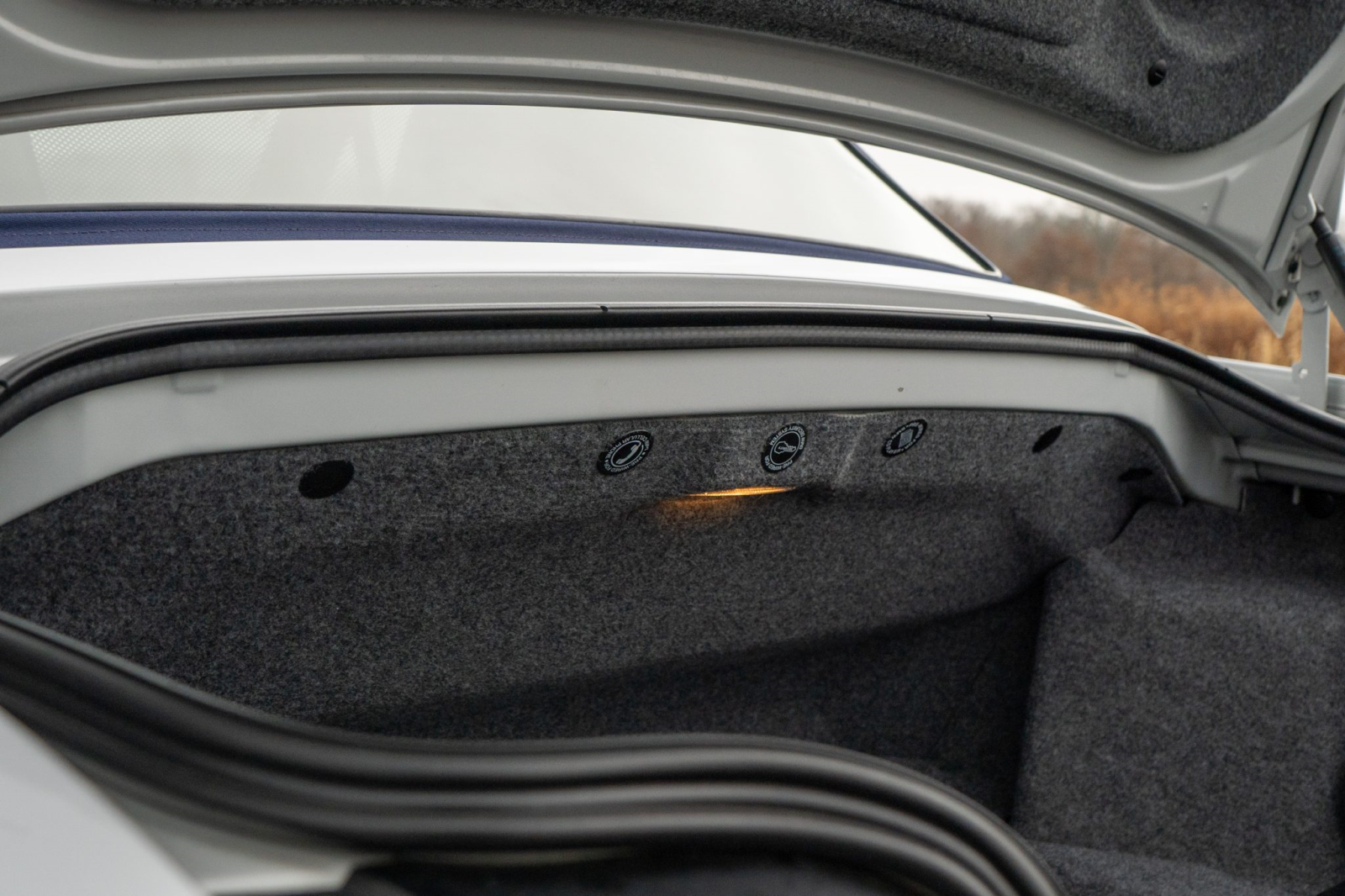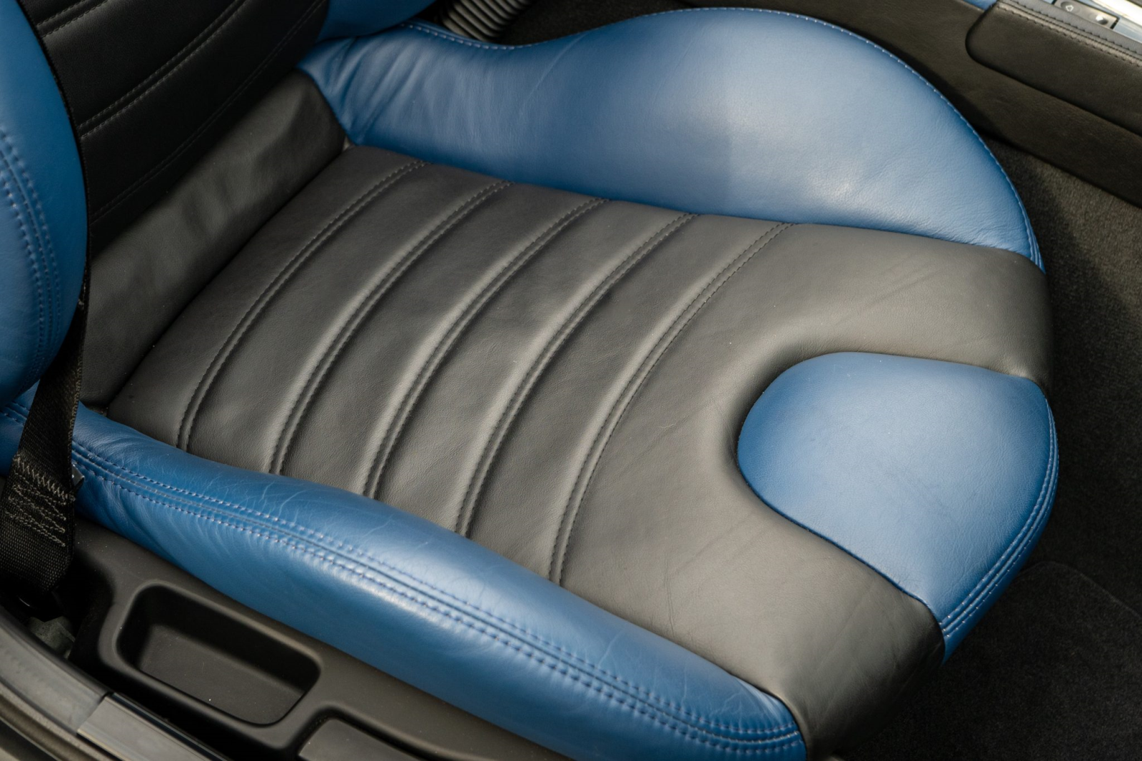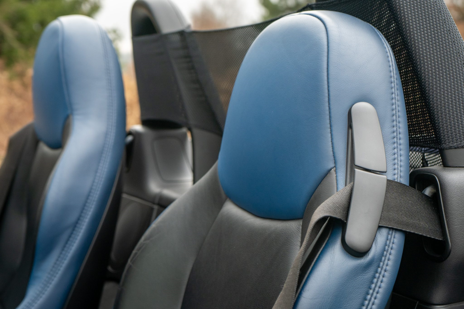 The cabin features Estoril Blue and black Nappa leather covering the heated sport seats, door panel inserts, and center console. Other appointments comprise a Harman Kardon sound system, roll hoops, cruise control, and a CD stereo.