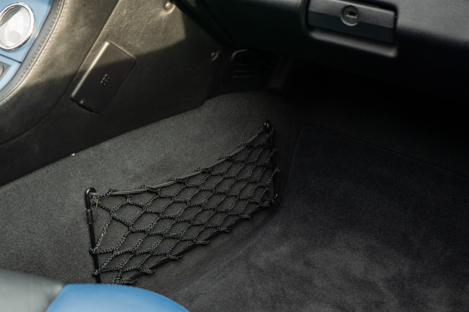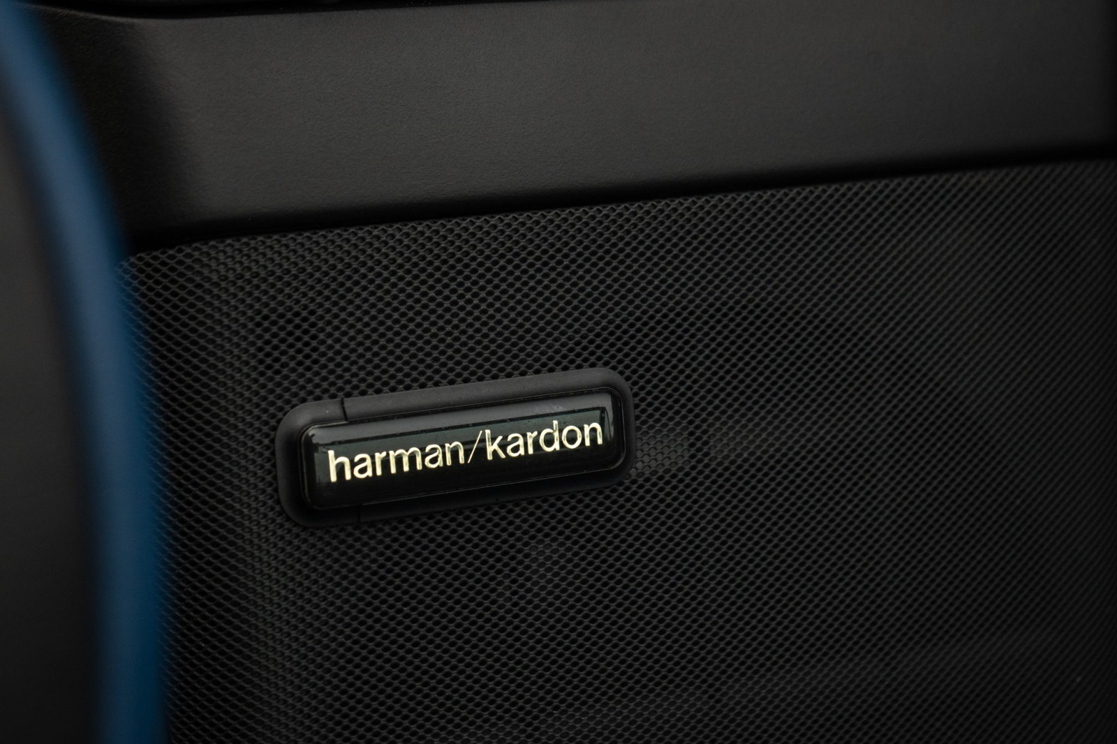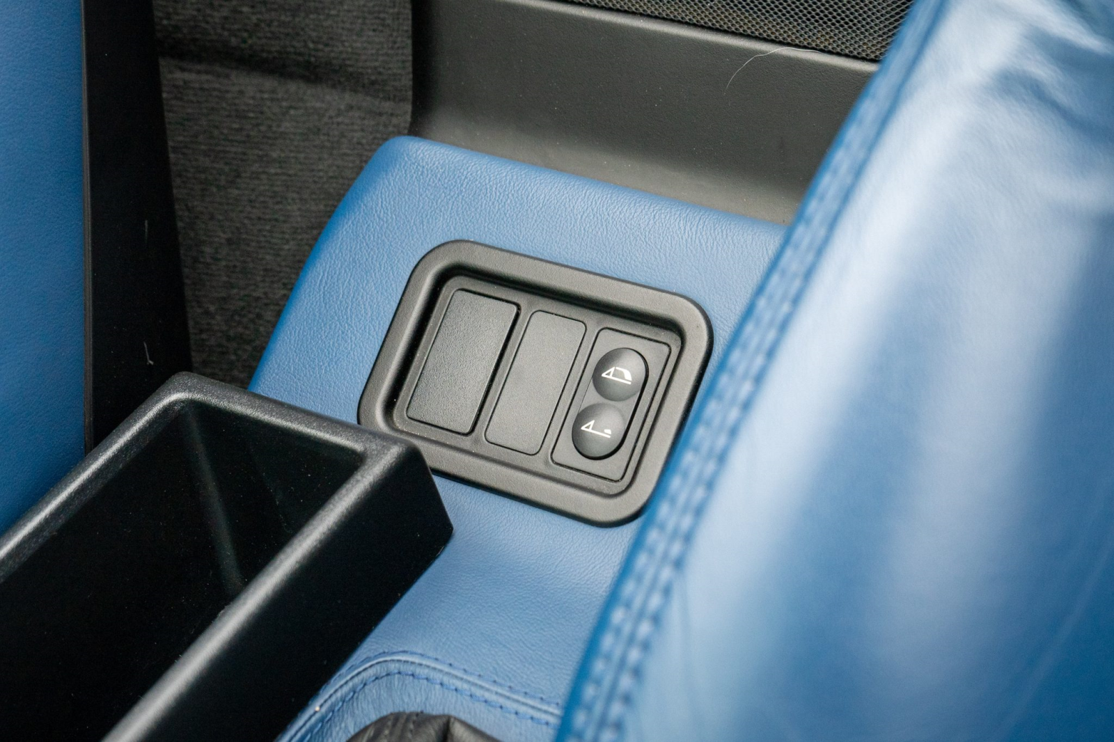 The cabin features Estoril Blue and black Nappa leather covering the heated sport seats, door panel inserts, and center console. Other appointments comprise a Harman Kardon sound system, roll hoops, cruise control, and a CD stereo.