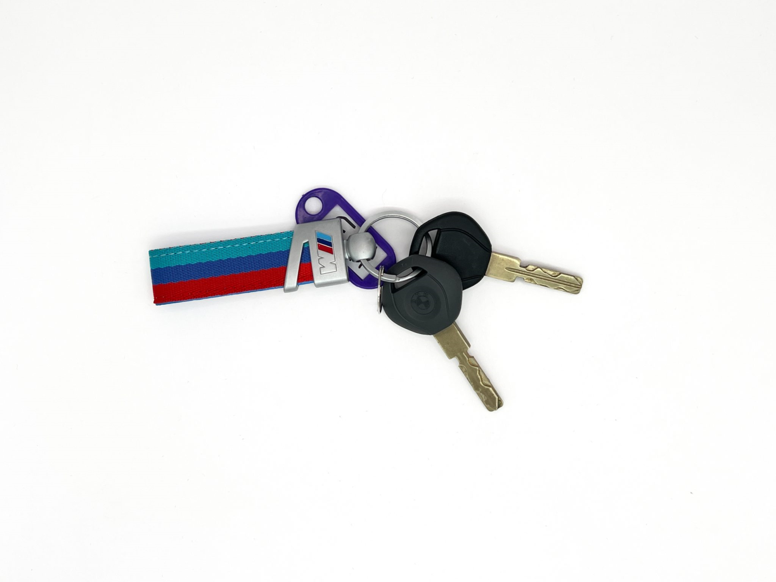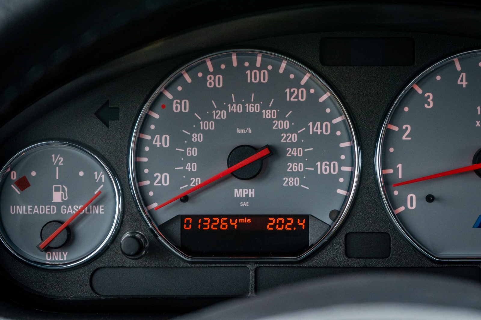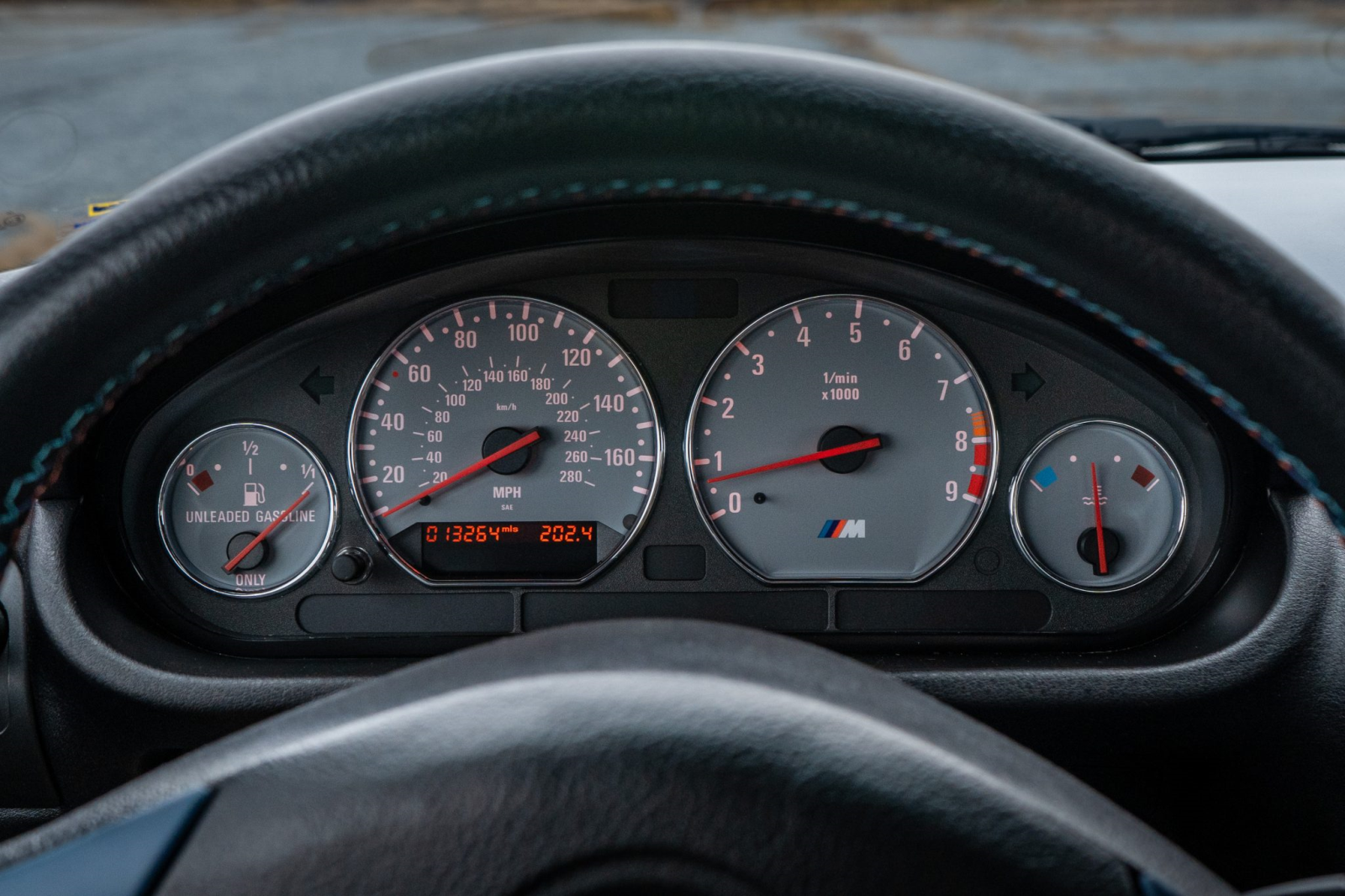 The M-branded leather-wrapped steering wheel features tri-color stitching and frames a tachometer with an 8k-rpm redline, a 170-mph speedometer, and auxiliary gauges. The digital odometer indicates 13k miles.