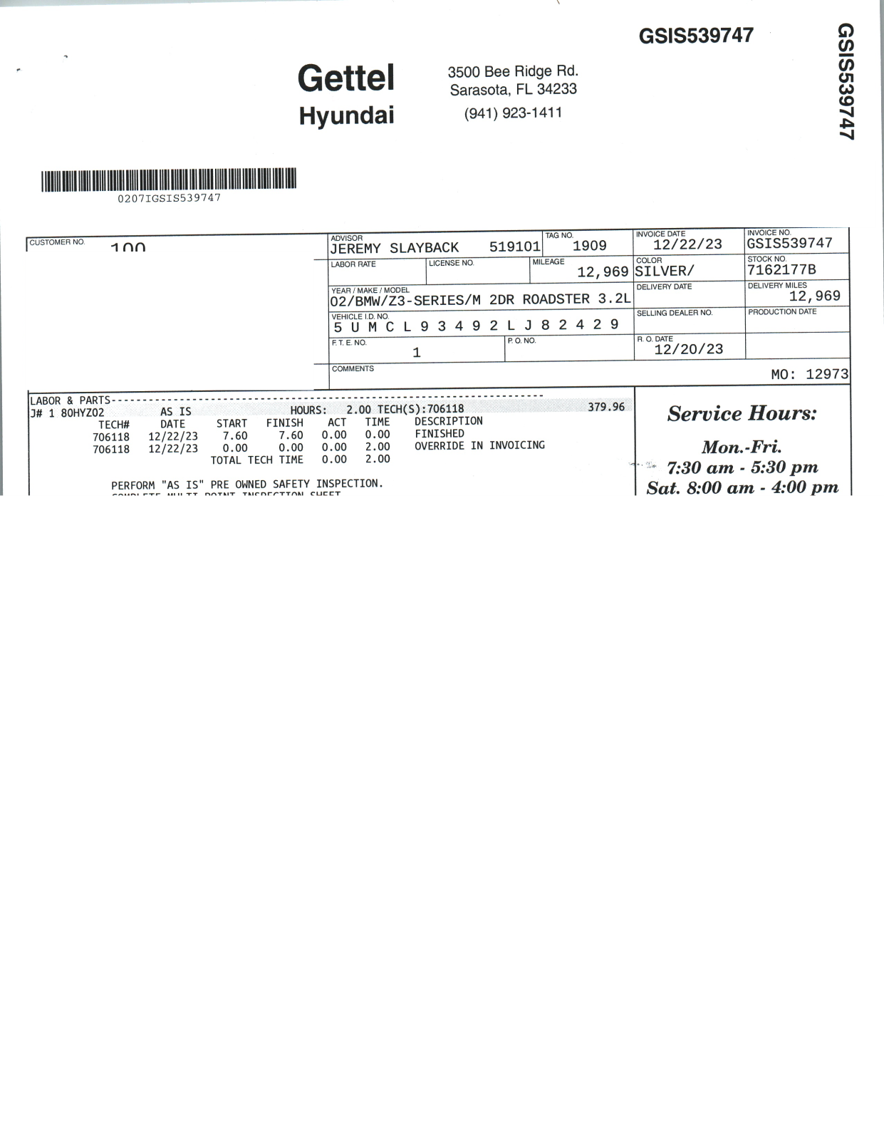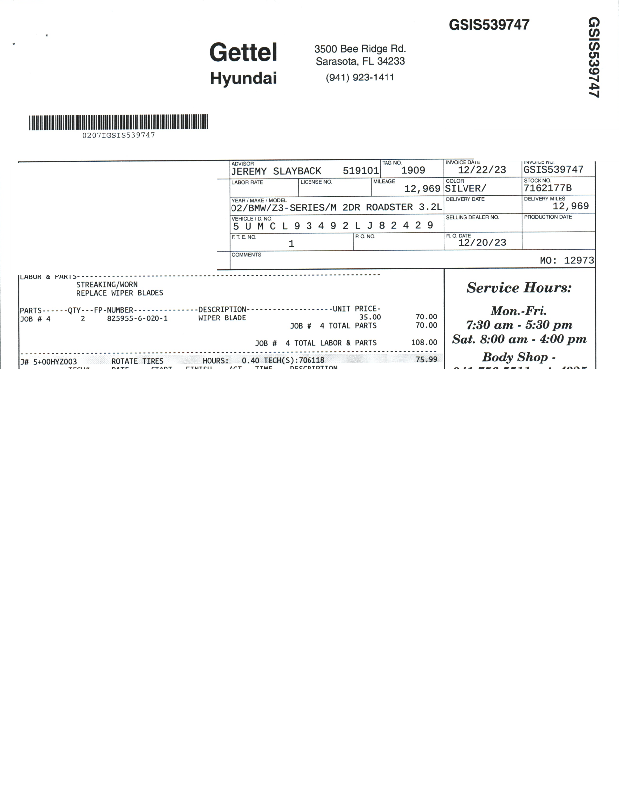 A car cover, a wind deflector, literature, and December 2023 service records are included in the sale.