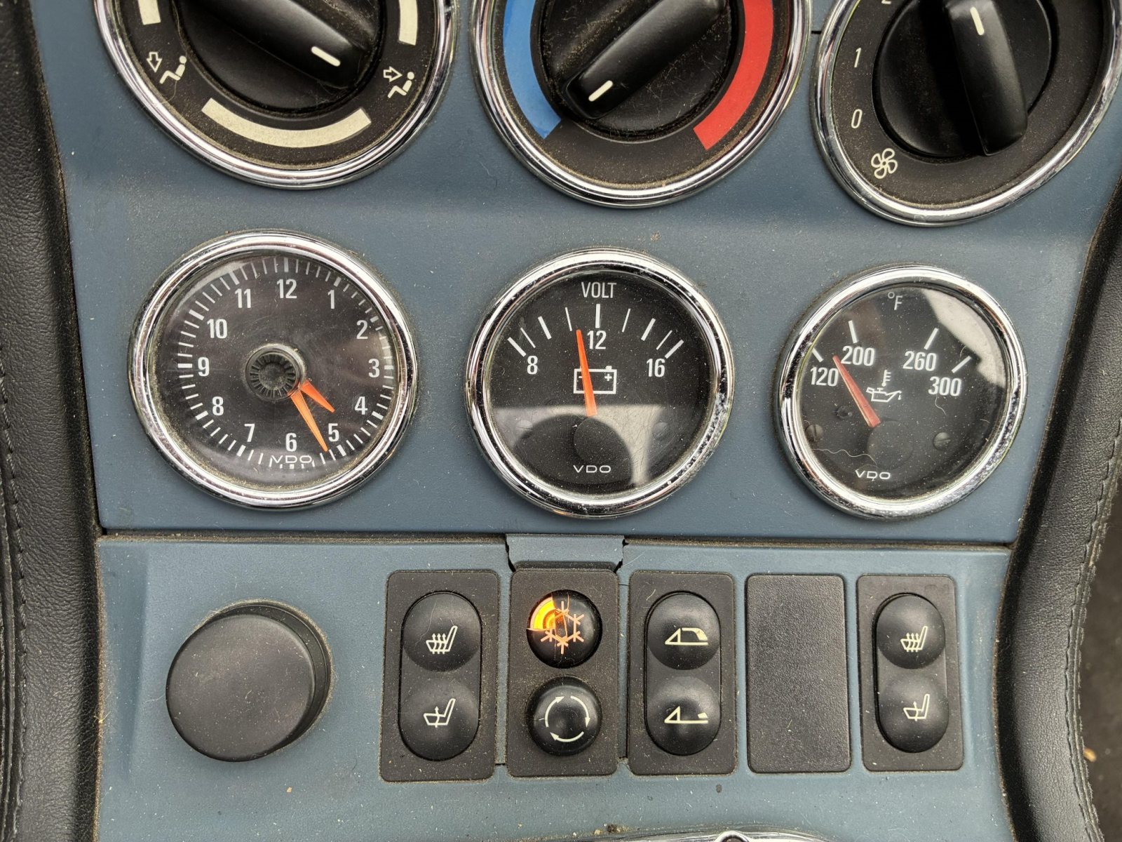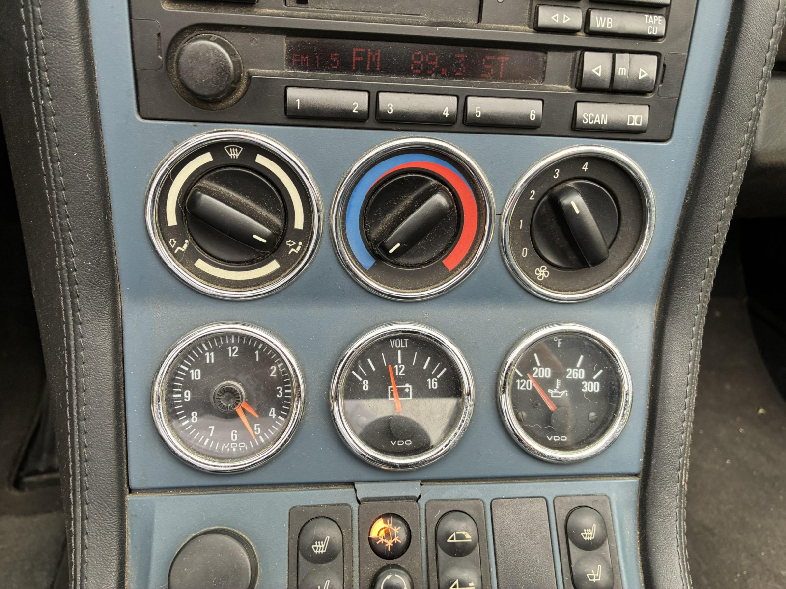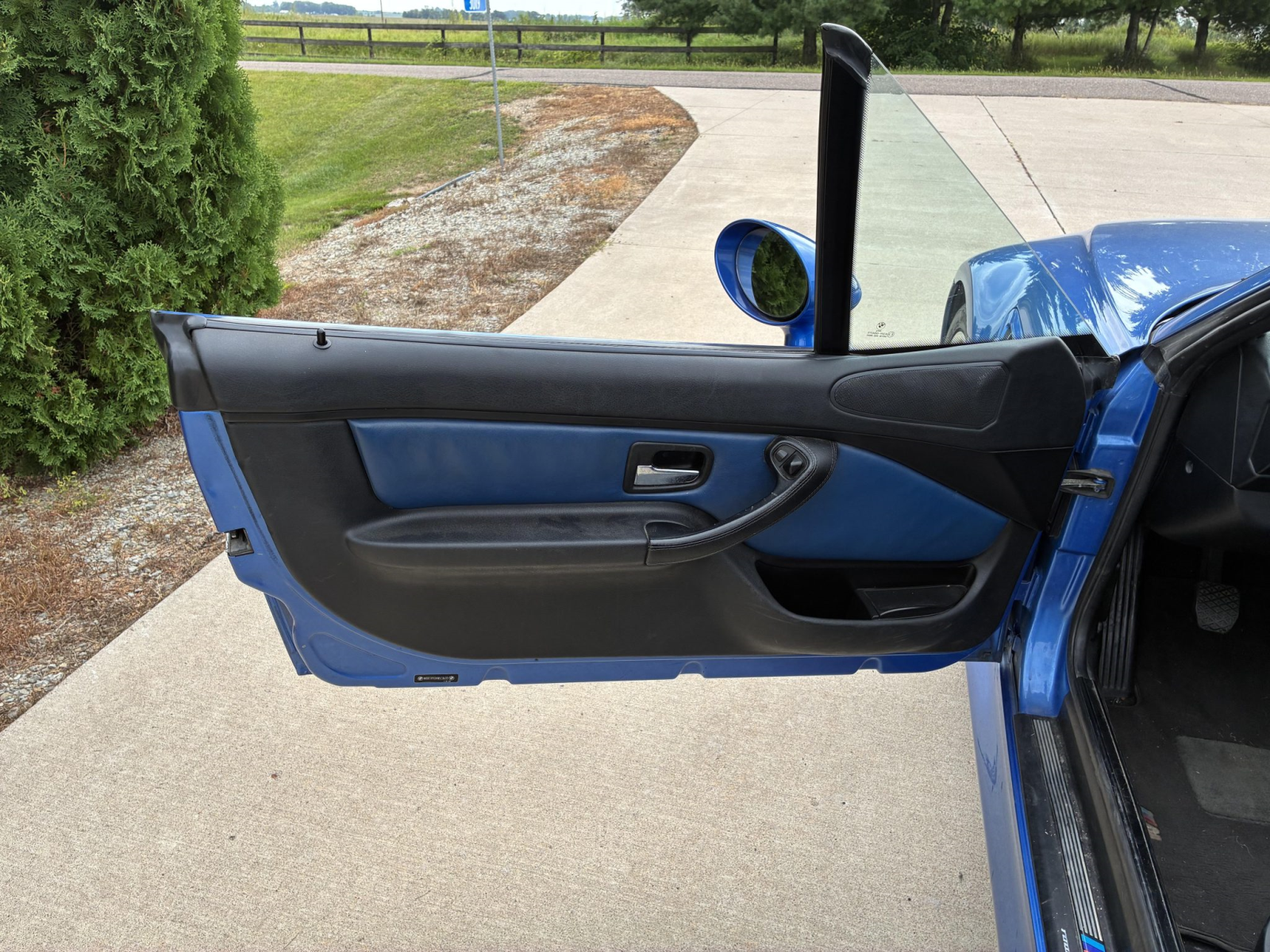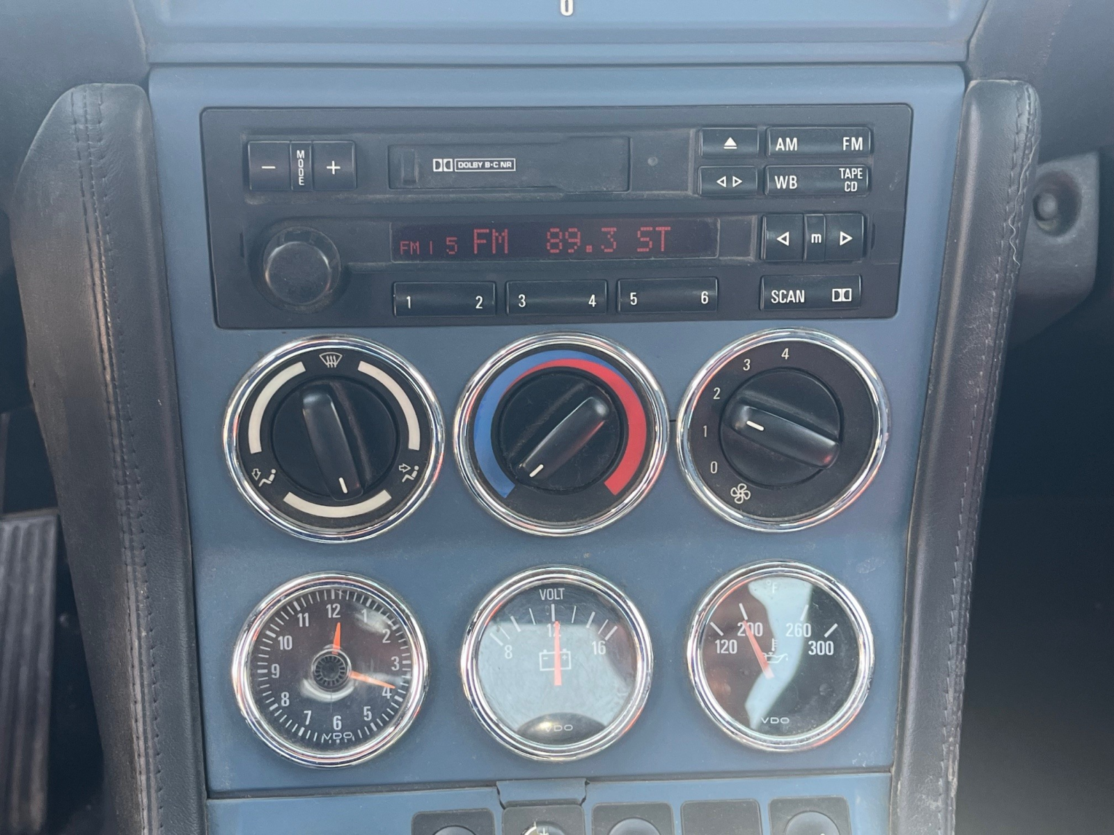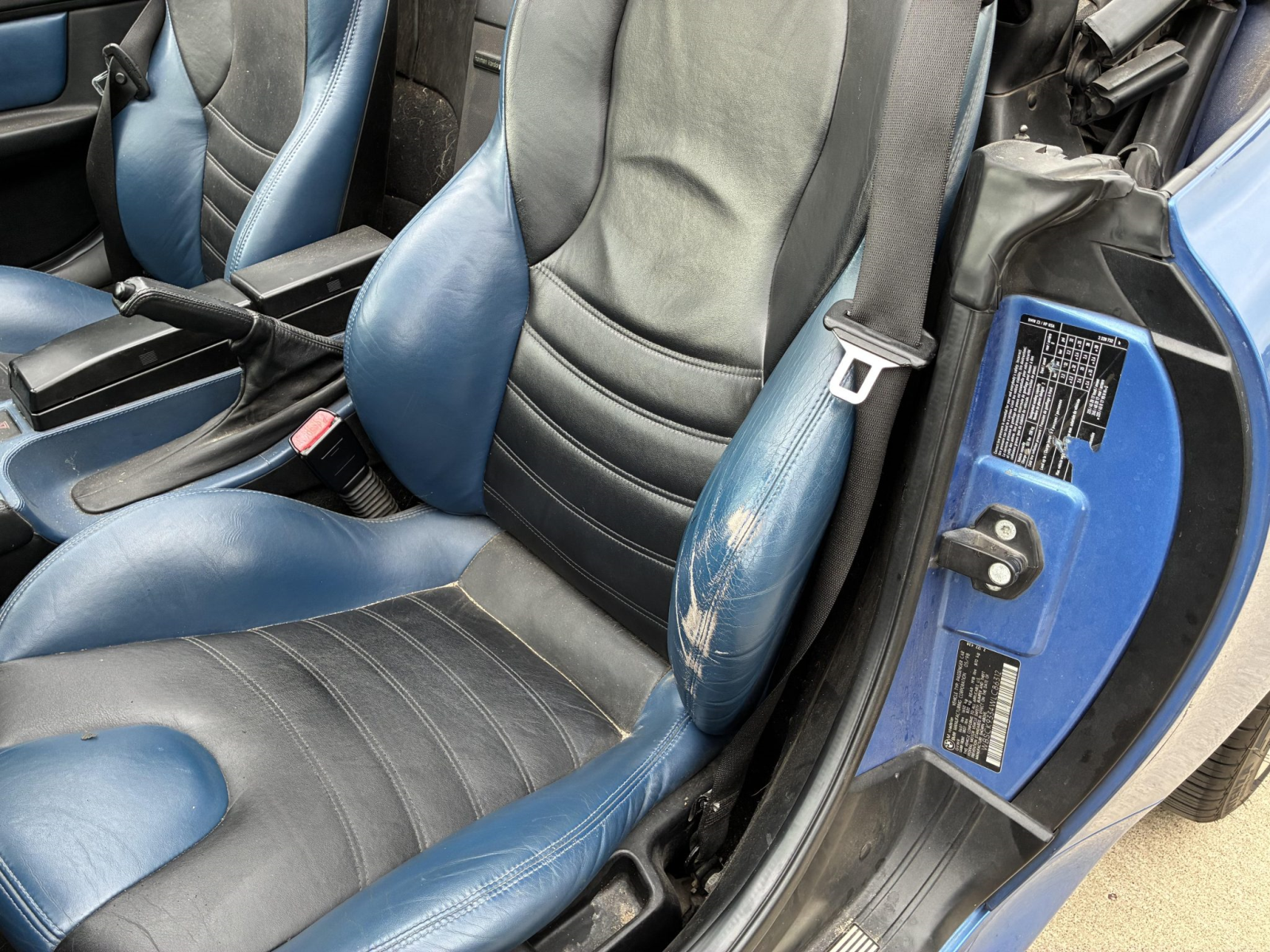 The cabin features black and Estoril Blue Nappa leather covering the heated sport seats, door panel inserts, and center console. Amenities include roll hoops, air conditioning, cruise control, a cassette stereo, and a Harman Kardon sound system. There is wear on the driver’s seat bolster.