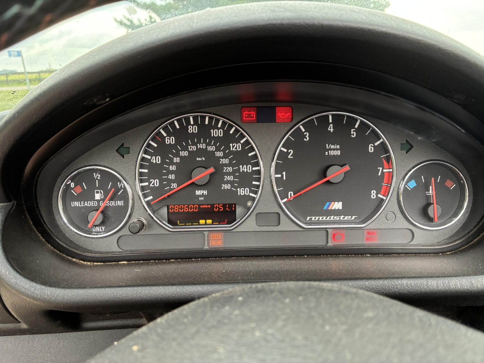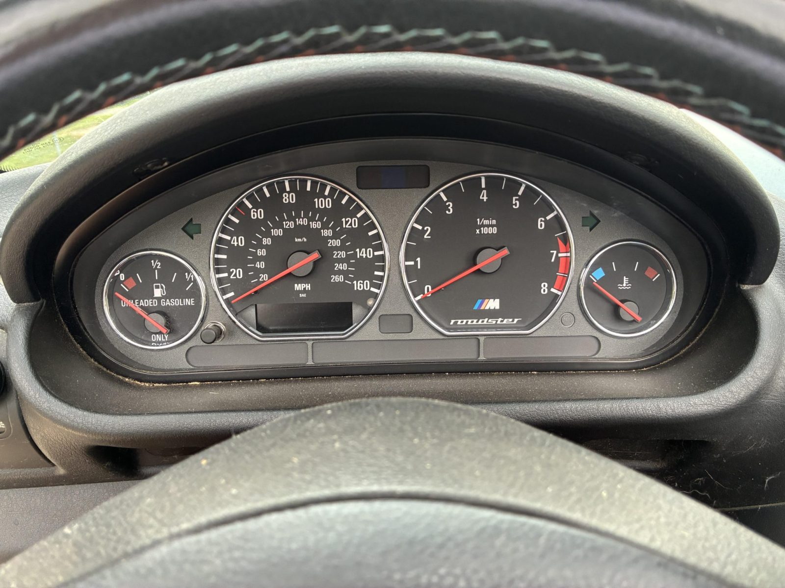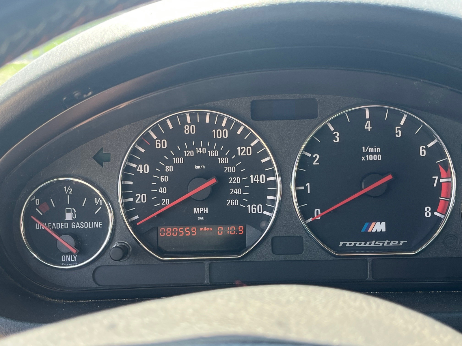 The M-branded leather-wrapped steering wheel features tri-color stitching and frames a tachometer with a 6,800-rpm redline, a 160-mph speedometer, and gauges for coolant temperature and fuel level. The digital odometer indicates 81k miles, approximately 35k of which were added under current ownership.