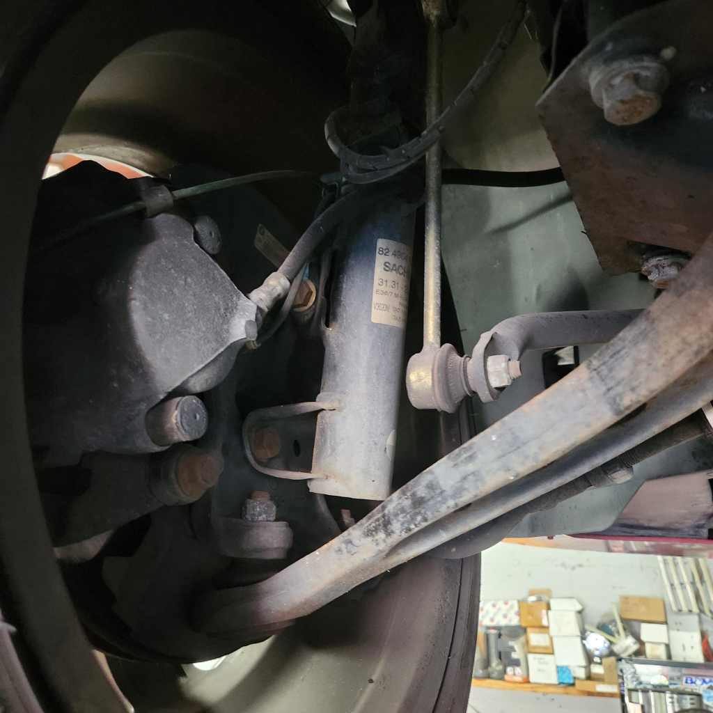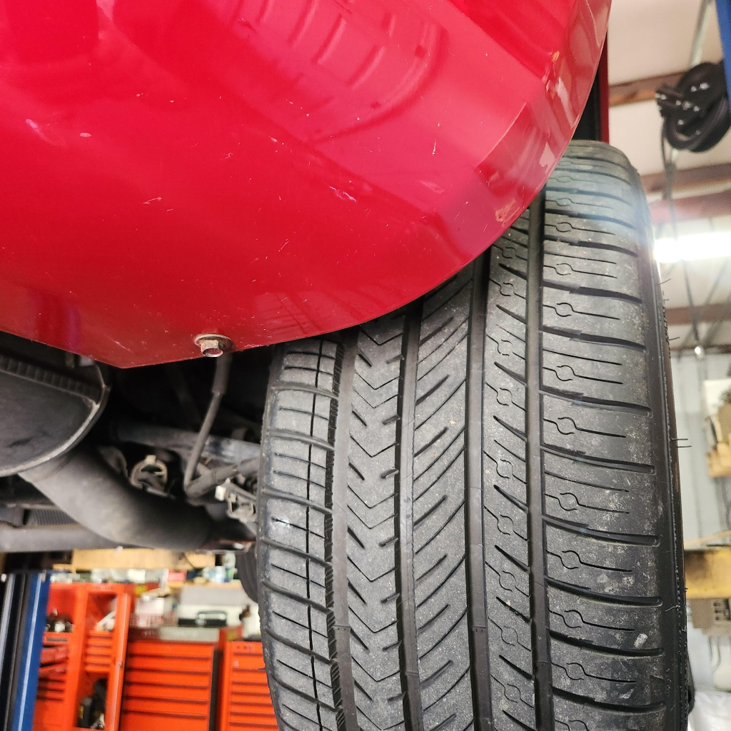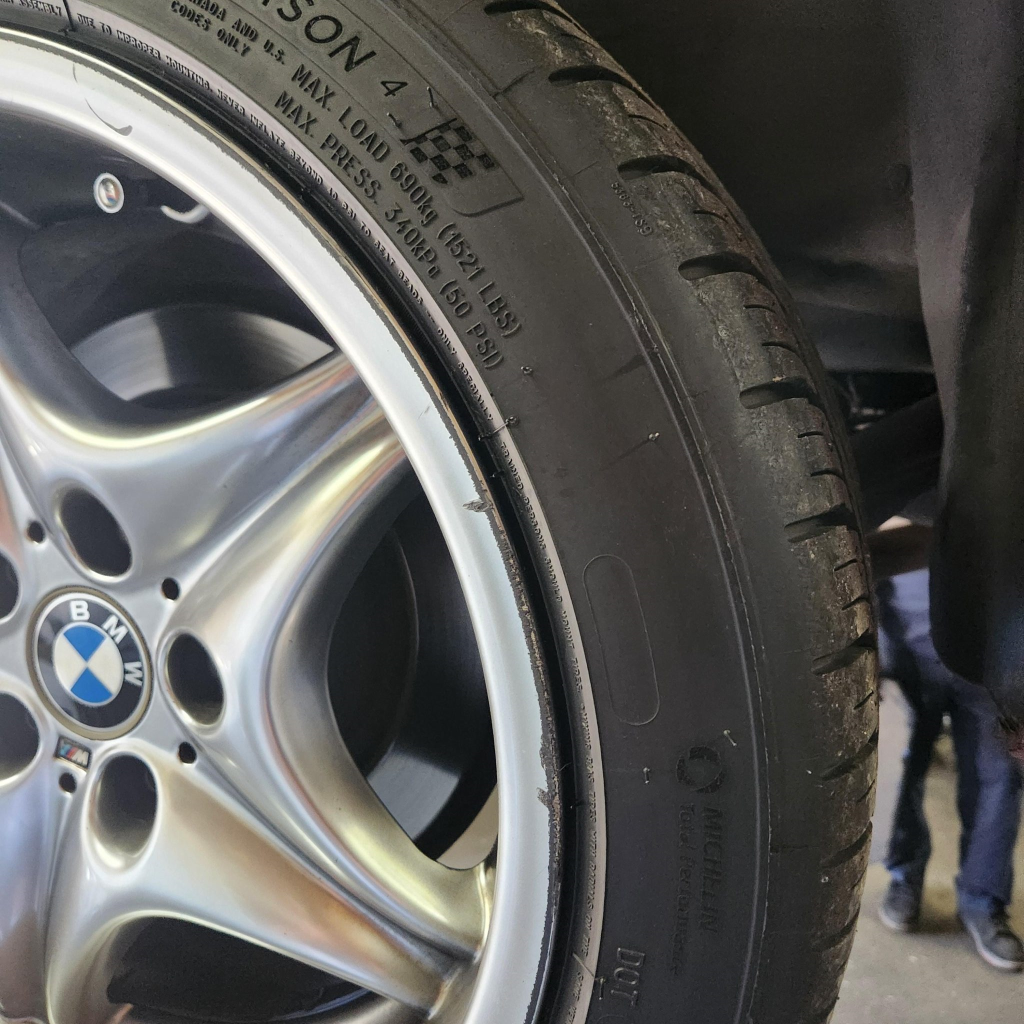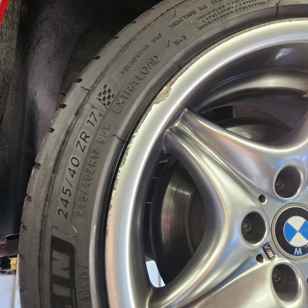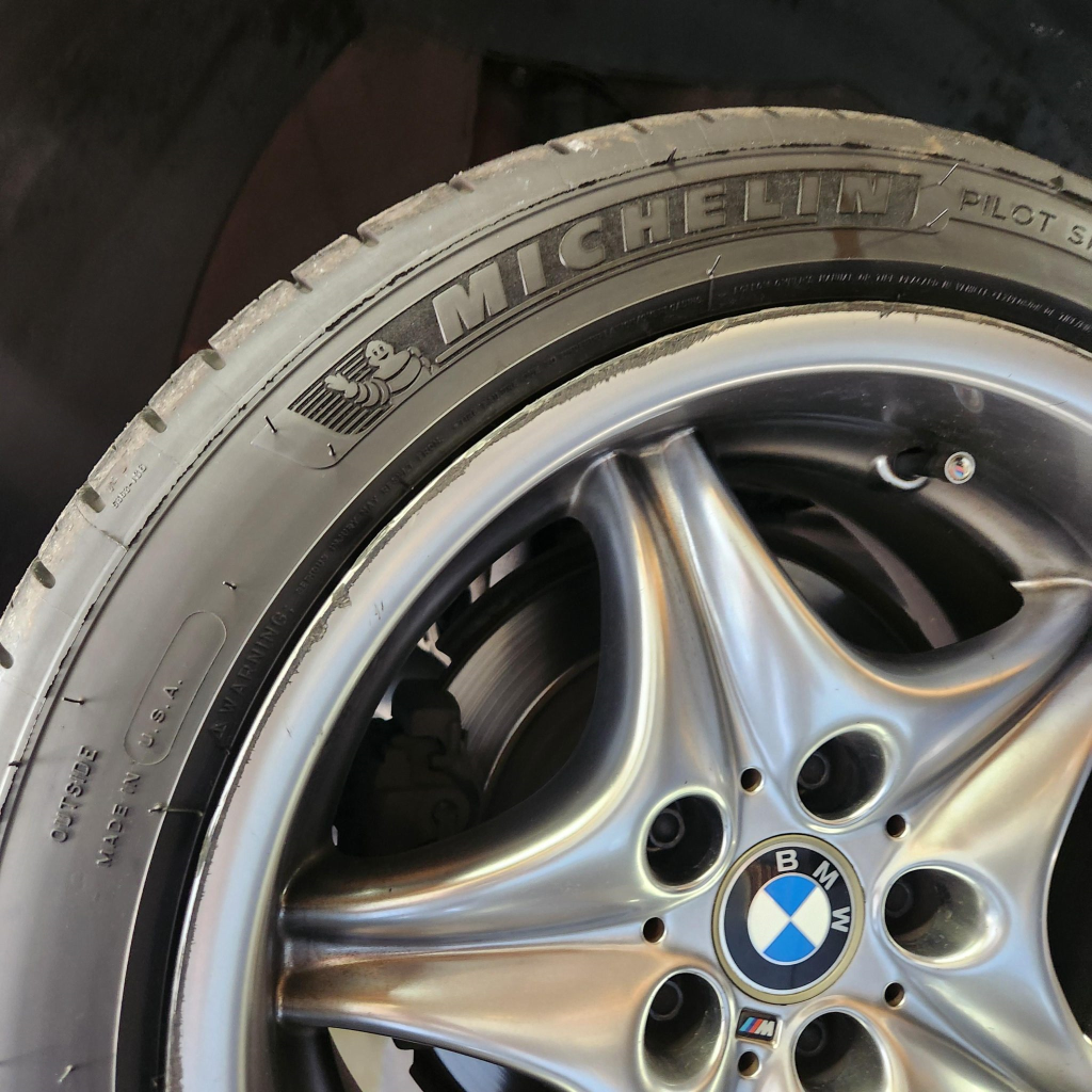Shadow-finished 17″ Style 40 wheels are mounted with 225/45 front and 245/40 rear Michelin Pilot Sport tires. The car is equipped with Dynamic Stability Control and All-Season Traction (AST), and braking is handled by four-wheel ventilated discs. The seller tells us that blemishes are visible on the rear wheels.