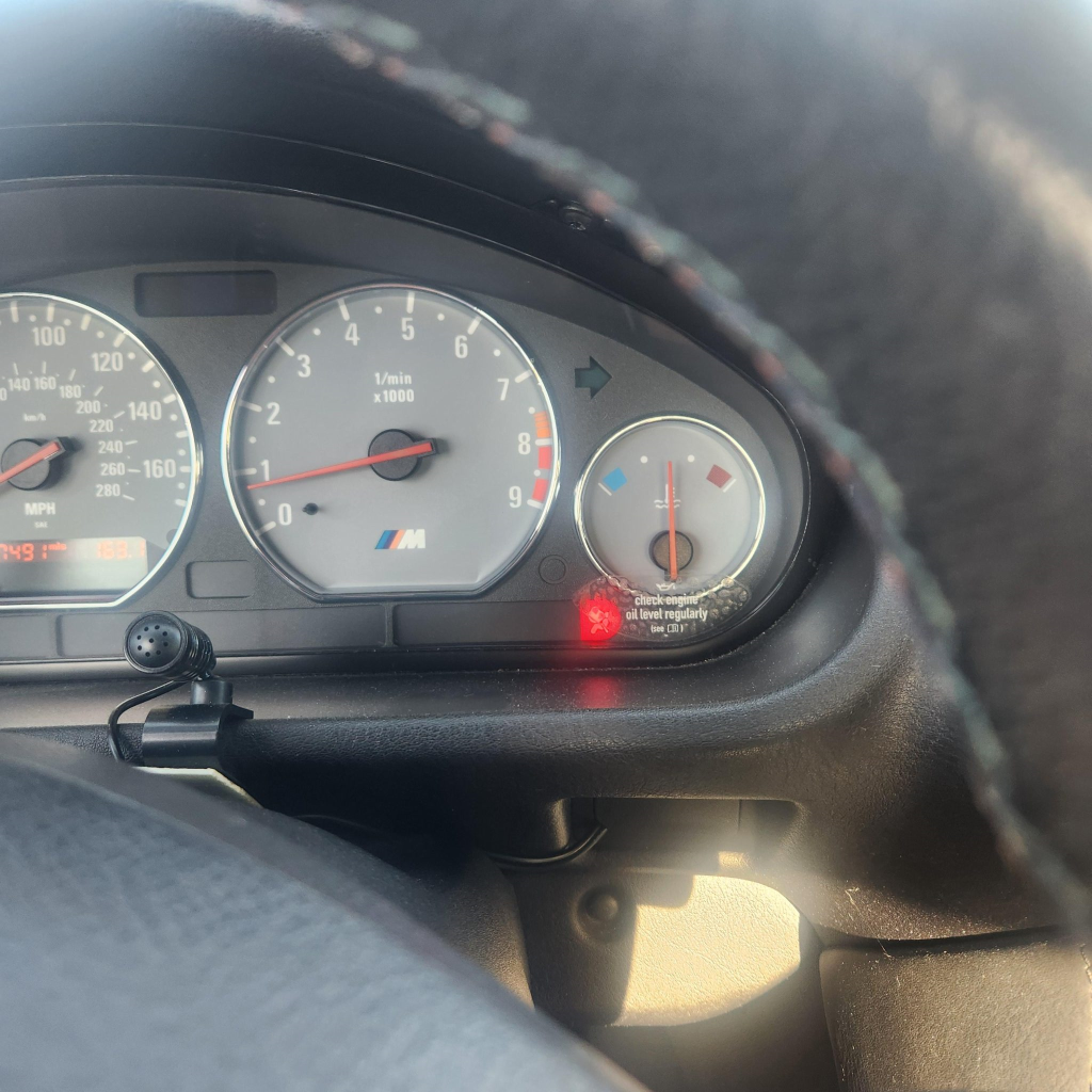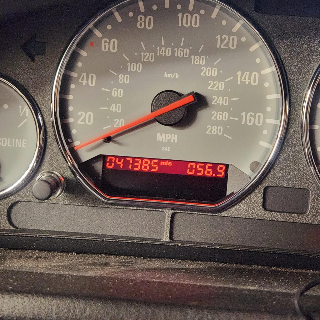 The M-branded leather-wrapped steering wheel features tri-color stitching and frames a tachometer with an 8k-rpm redline, a 170-mph speedometer, and gauges for coolant temperature and fuel level. The digital odometer indicates 47k miles, approximately 41k of which were added under current ownership.